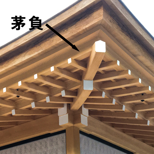 茅負は、伝統的な日本の社寺建築において、屋根の軒先に用いられる飾りの一種です。茅負は、茅(かや)や草などの自然素材を用いて、軒の垂木や梁の装飾を施し、防護や美観を兼ね備えています。特に神社や寺院の屋根の端に見られます。