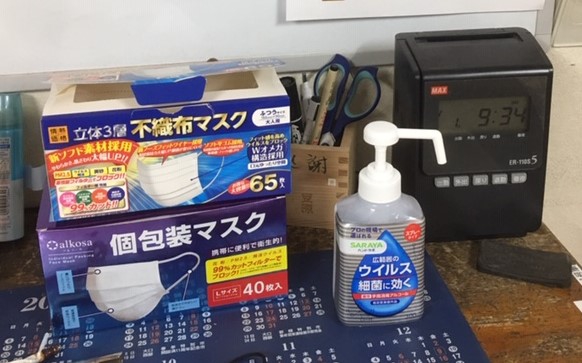 連絡をください、と伝え、タイムカードの隣にマスクと消毒液を置きました。