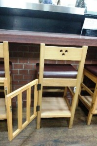 カウンターに並んでいるイスに何か取っ手のような物がついているので、何なのかなぁと思って、お店の人に聞いてみたところ、お店が狭くてお客様が荷物を置くスペースがなかったので、イスの下にお客様のカバンを入れたり、荷物を入れられるように作ってもらったんです。との事でした。