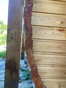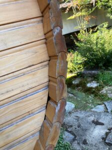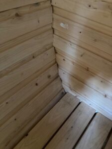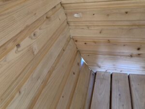 トップ の写真はバレルサウナの内部から、奥の妻壁と外周の壁に隙間が発生しています。