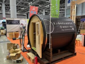 チラシを置き、黒い箱型パネルサウナを並べ、