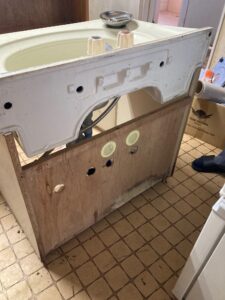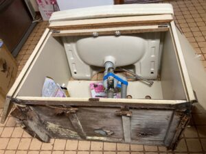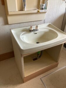 しかし洗面台の台輪部分(洗面台と床とが接する部分)が腐ってしまっていて、まともに自立しません。