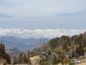 まだ寒く、路肩には雪が残っていますが、お寺からは美しい雪山が見えます。